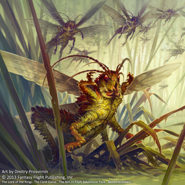 In un batter d’occhio i due sono circondati e attaccati da un famelico stormo di cavallette giganti (Neekerbreekers). I loro colpi di spada, per tentare di liberarsi dall’assalto, colpiscono qualche creatura, ma ciò non è sufficiente. Sembrano essere sul punto di soccombere quando Lutholinnad riesce con un canto di pace a tirarli fuori dallo sciame di insetti. Questo però non è sufficiente poiché non appena si allontanano per cercare di fuggire, anche l’incantesimo dell’Elfa cessa di esercitare il suo effetto, dunque le voraci e fameliche locuste si gettano immediatamente sulla preda più vicina: ora è Lutholinnad il loro pasto prescelto. Rimasta indietro per aiutare i suoi compagni, è una figura appena visibile attraverso il nugolo di insetti che sciama intorno a lei.